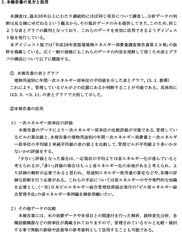 本編は「ダイジェスト版」であり、調査結果についての概説である。調査結果に関する詳細については『平成28年度 建築物エネルギー消費量調査報告書第39報』を活用して頂きたいと考える。
