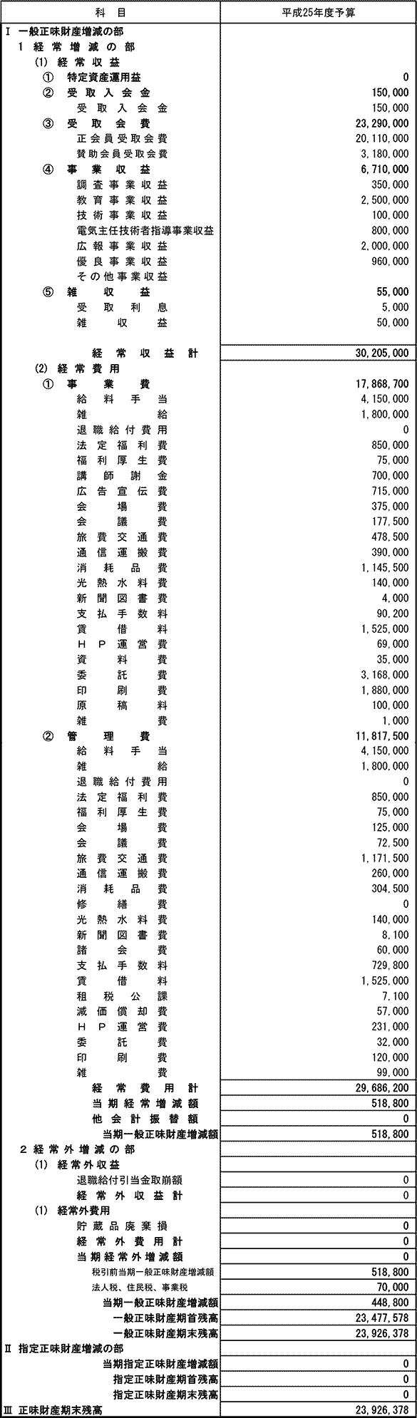 平成25年度 収支予算書(正味財産増減方式)平成25年4月1日から平成26年3月31日まで